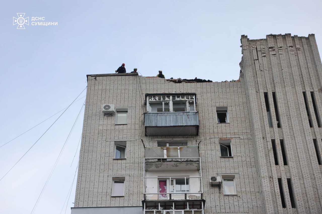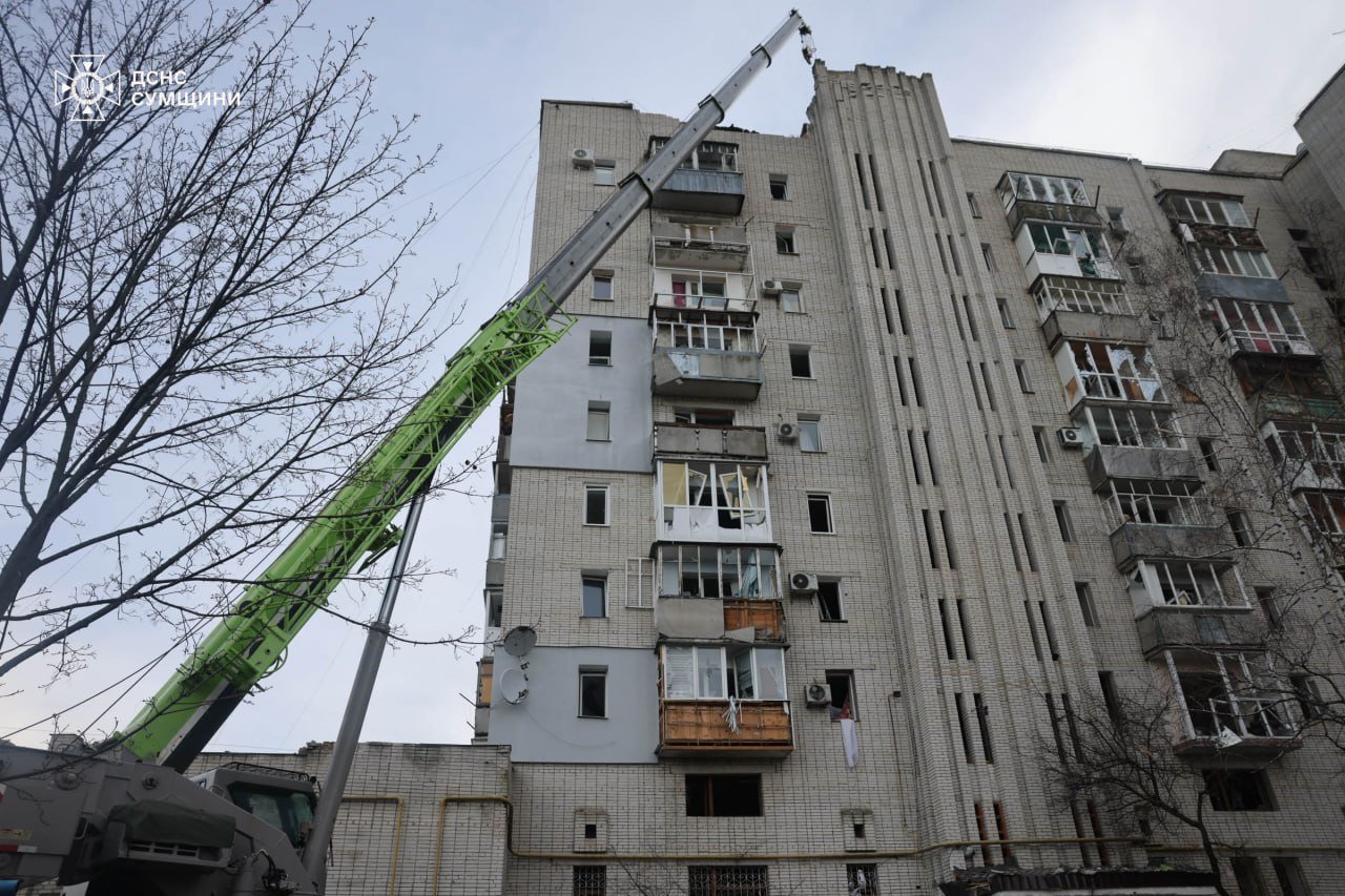 Тривають аварійно-відновлювальні роботи: здійснюється демонтаж аварійних конструкцій. До робіт залучено верхолазів ДСНС та спеціальну техніку для виконання висотних операцій.
