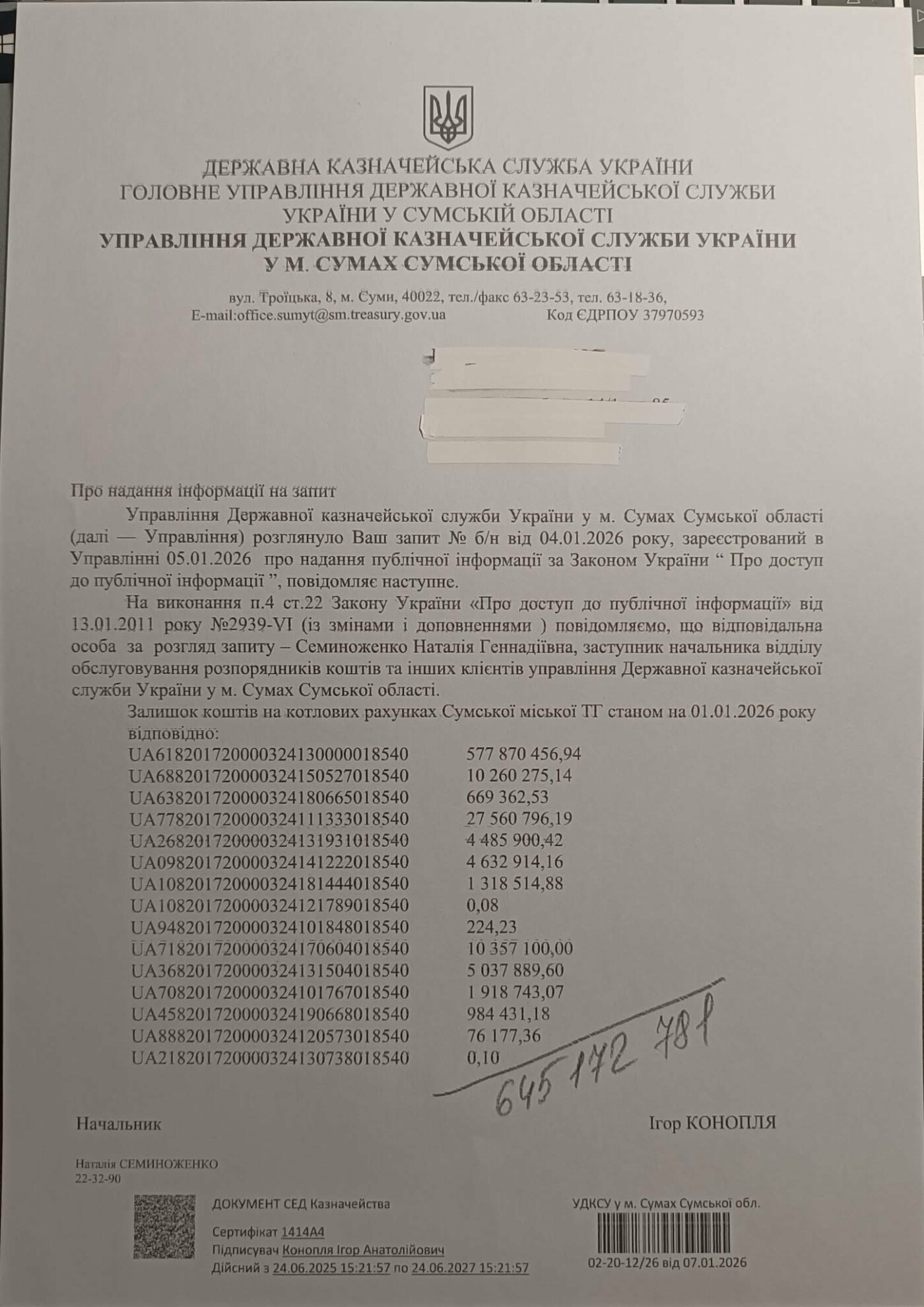 Залишок коштів на котлових рахунках Сумської міської радистаном на 1 січня 2026 року становить понад 645 млн за 2025 рік.