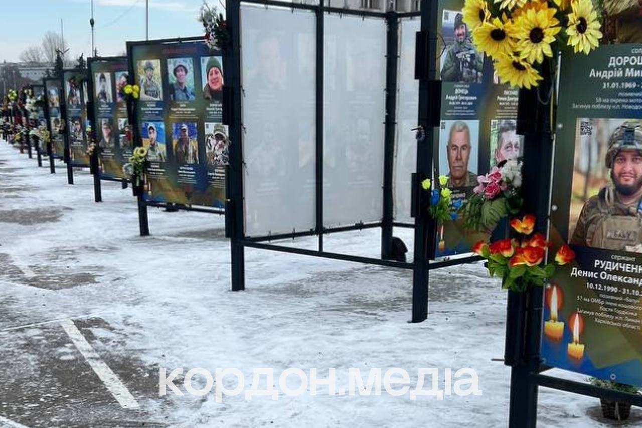Вибуховою хвилею позривало банери зі світлинами загиблих військових. Їх вже прикріпили назад, а один порваний — зняли. Також у будівлі поблизу вибите вікно, — дізналися воєнкори Кордон.Медіа на місці події.