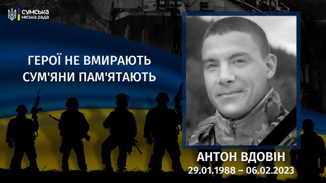 Минуло три роки з дня загибелі Антона Вдовіна Антон народився 29 січня 1988 року в місті Суми. Навчався в школі № 7. Закінчив юридичний факультет СНАУ. З початком повномасштабного вторгнення добровільно став до лав ЗСУ. Проходив службу в 47-й окремій артбригаді. Згодом був переведений до 68-ї окремої єгерської бригади ім. Олекси Довбуша.