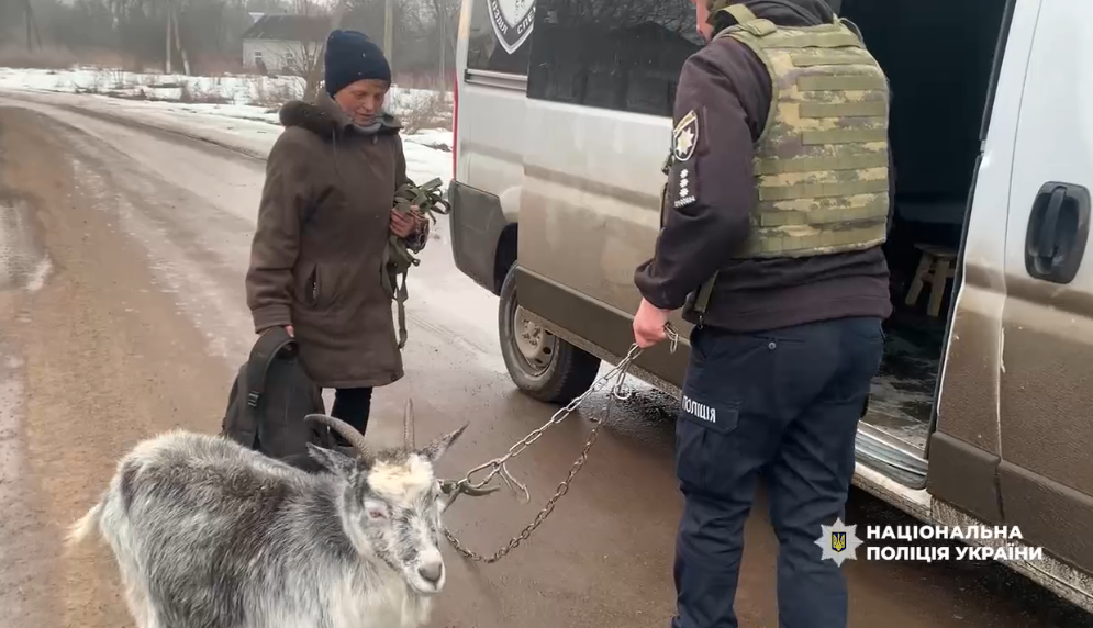 Попри складну безпекову ситуацію, поліцейські дісталися до жінки та організували евакуацію. Разом із нею вивезли і домашніх улюбленців: козу Катю, собак Жулю та Дена, а також кота. Усіх доставили у більш безпечне місце.